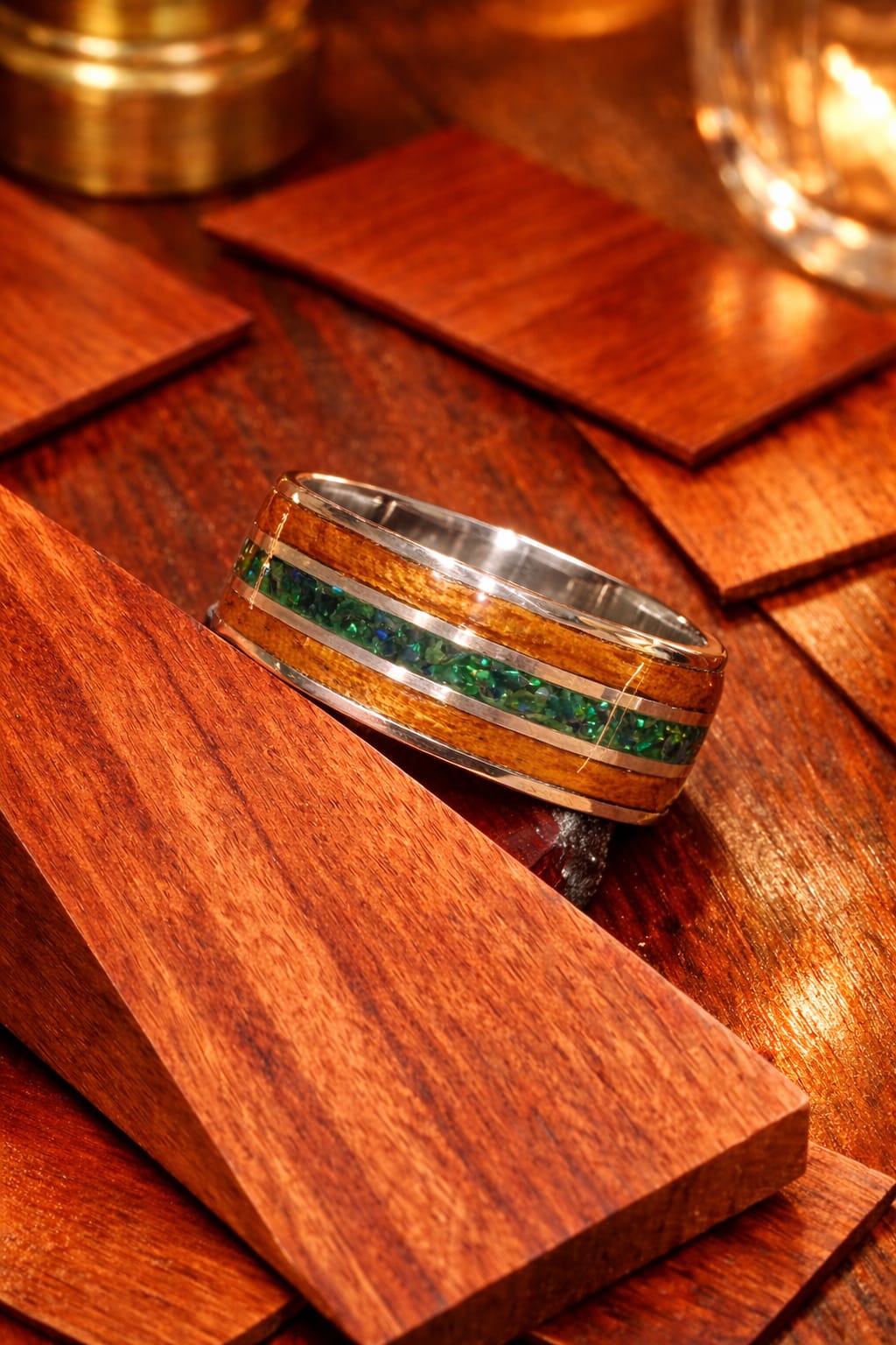 Cette bague artisanale au design raffiné célèbre la richesse des matières naturelles dans une composition lumineuse et sur mesure. Son motif à trois rainures personnalisables vous permet de créer votre propre équilibre entre bois précieux, pierres naturelles (lapis-lazuli, malachite…) et opales aux éclats irisés.