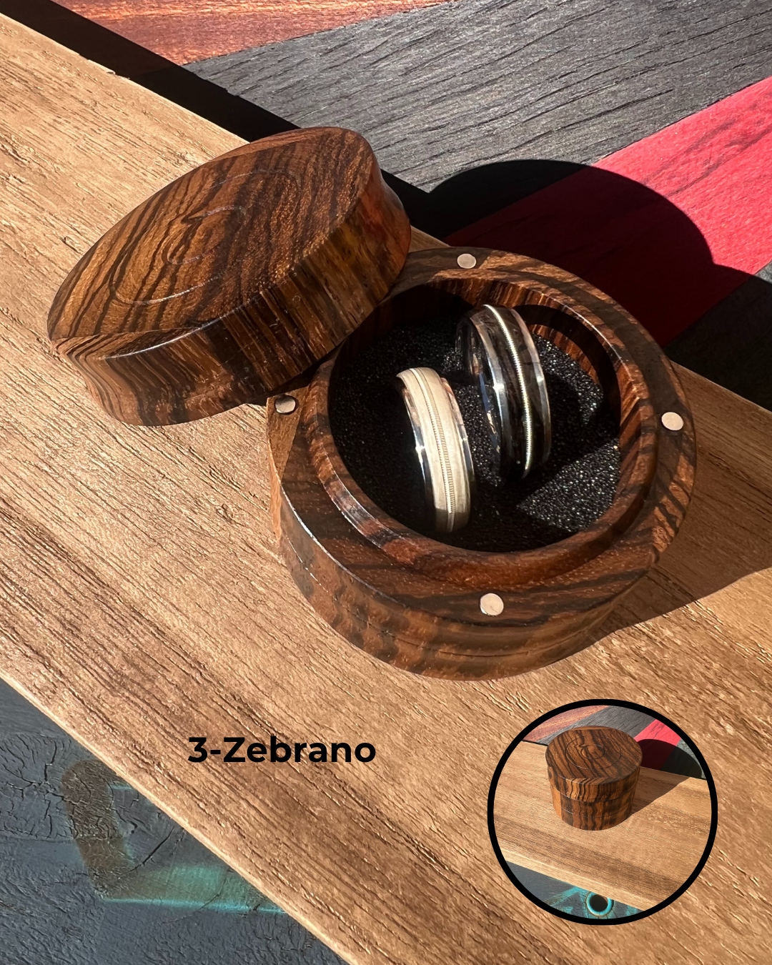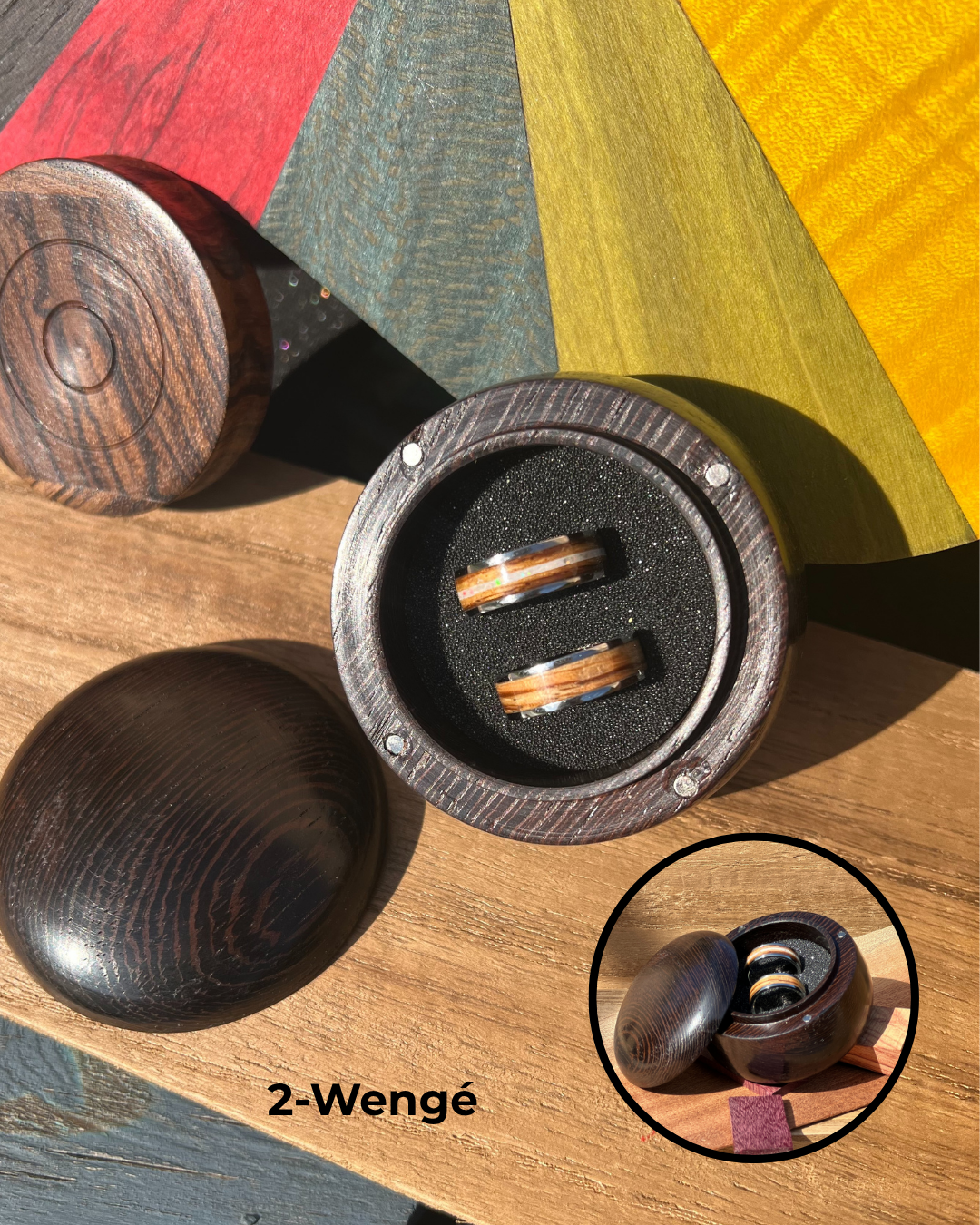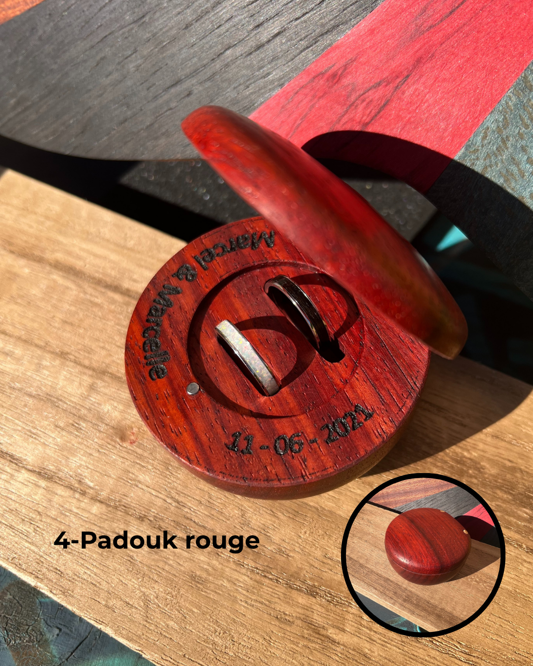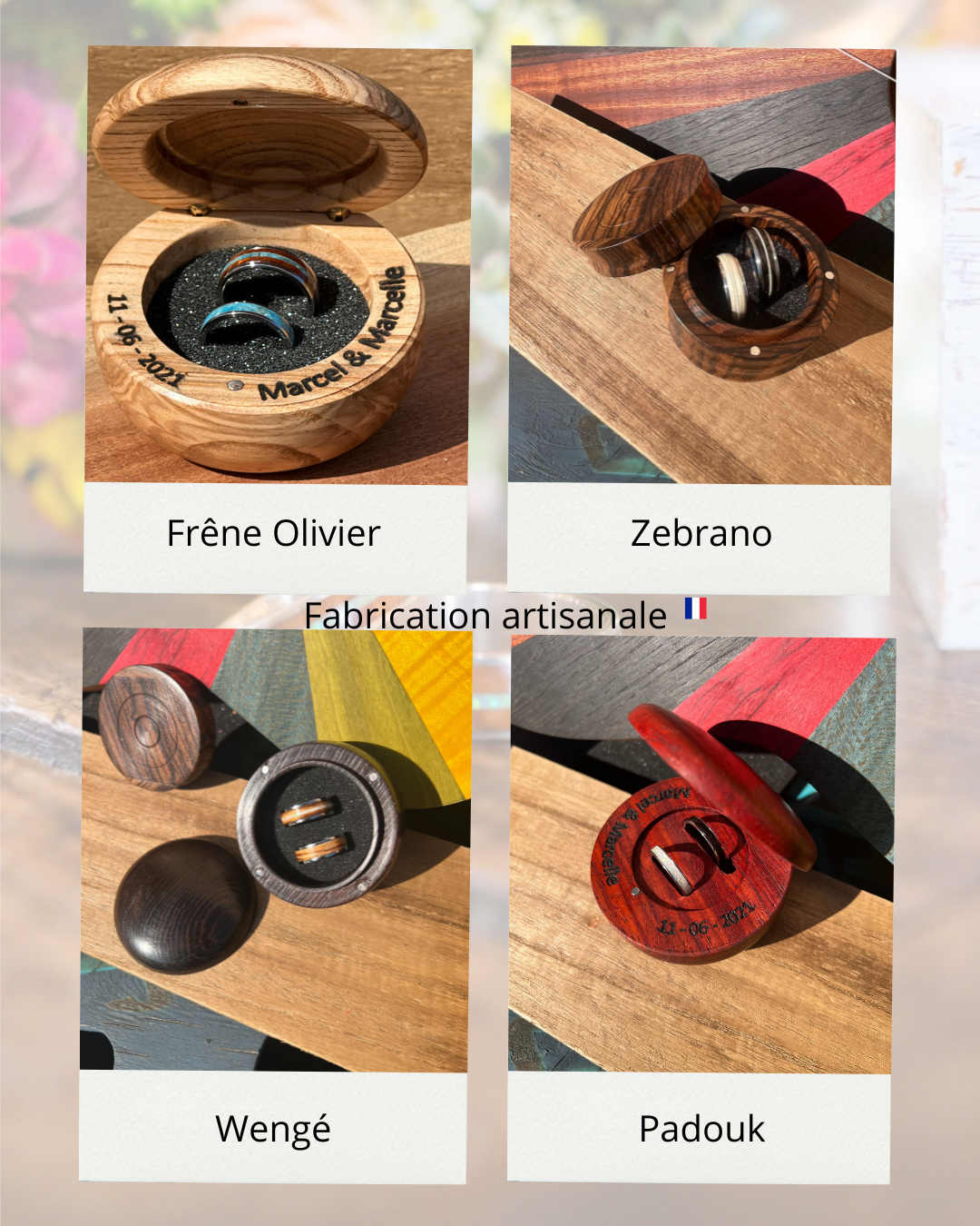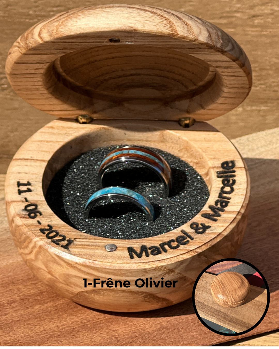 Réalisé à la main par un artisan local, chaque écrin est unique et raconte l’histoire de son bois.